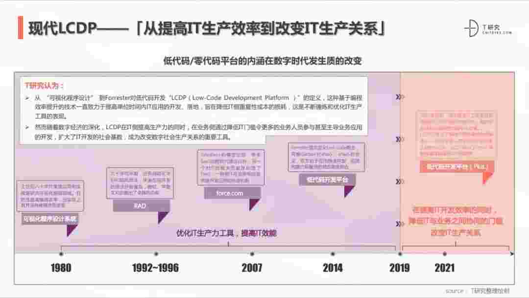2020年前后,,,源于提高IT工作者开发效能的LCDP不断进化和衍生,,,面对业务导向日益明显的数字化变革。。。LCDP衍生出了面向不同对象的升级服务——面向专业人群的LCDP和业务人群的NCDP,,LCDP与NCDP的不同服务属性被逐渐认可和接受。。。 LCDP在提高IT开发效率的同时,,,,降低IT与业务之间协同的门槛改变IT生产关系。。